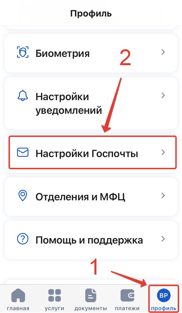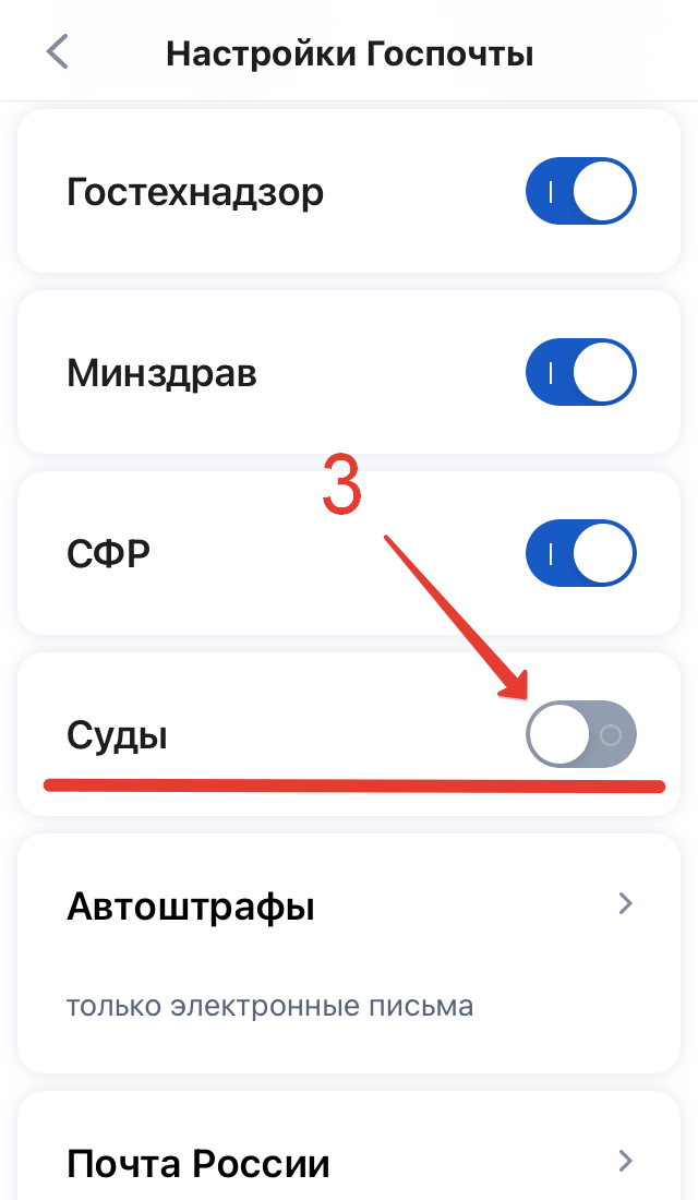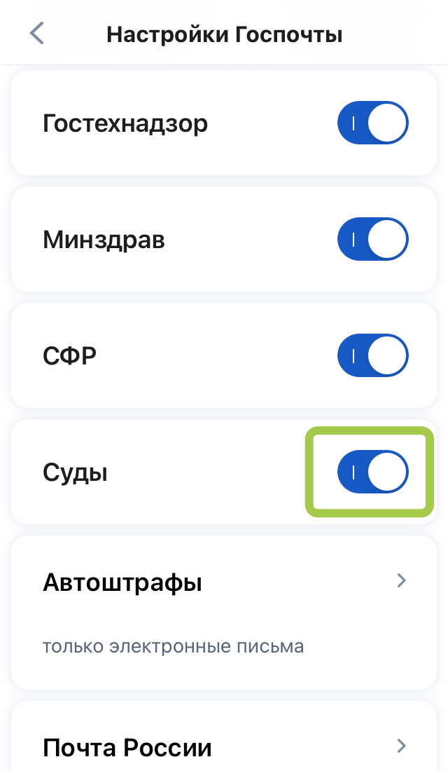 Откройте «Настройки Госпочты» в мобильном приложении «Госуслуги» и установите переключатель в строке «Суды» и "Почта России" в положение «включено»: